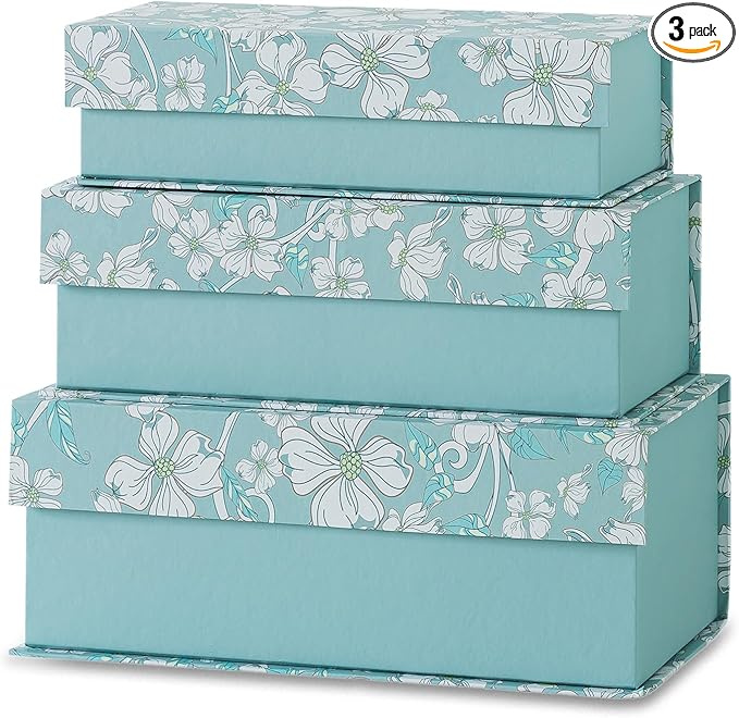 Keep your home organized with style using this set of 3 decorative cardboard storage boxes. Featuring a beautiful blue botanical pattern and magnetic closures, these boxes protect and neatly store your important items. The nesting design saves space when not in use, making them perfect for desks, shelves, or closets. Functional and decorative, these boxes are ideal for organizing documents, photos, memory items, or other keepsakes while enhancing your home décor