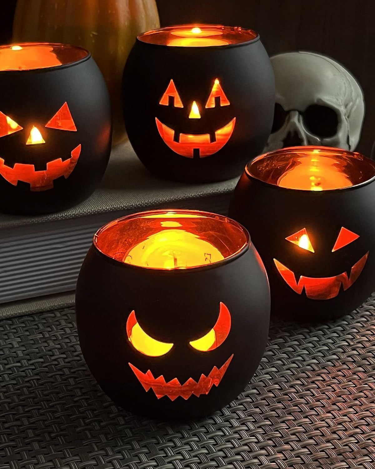 3.Set of 6 black glass votive holders with classic Jack O’ Lantern faces