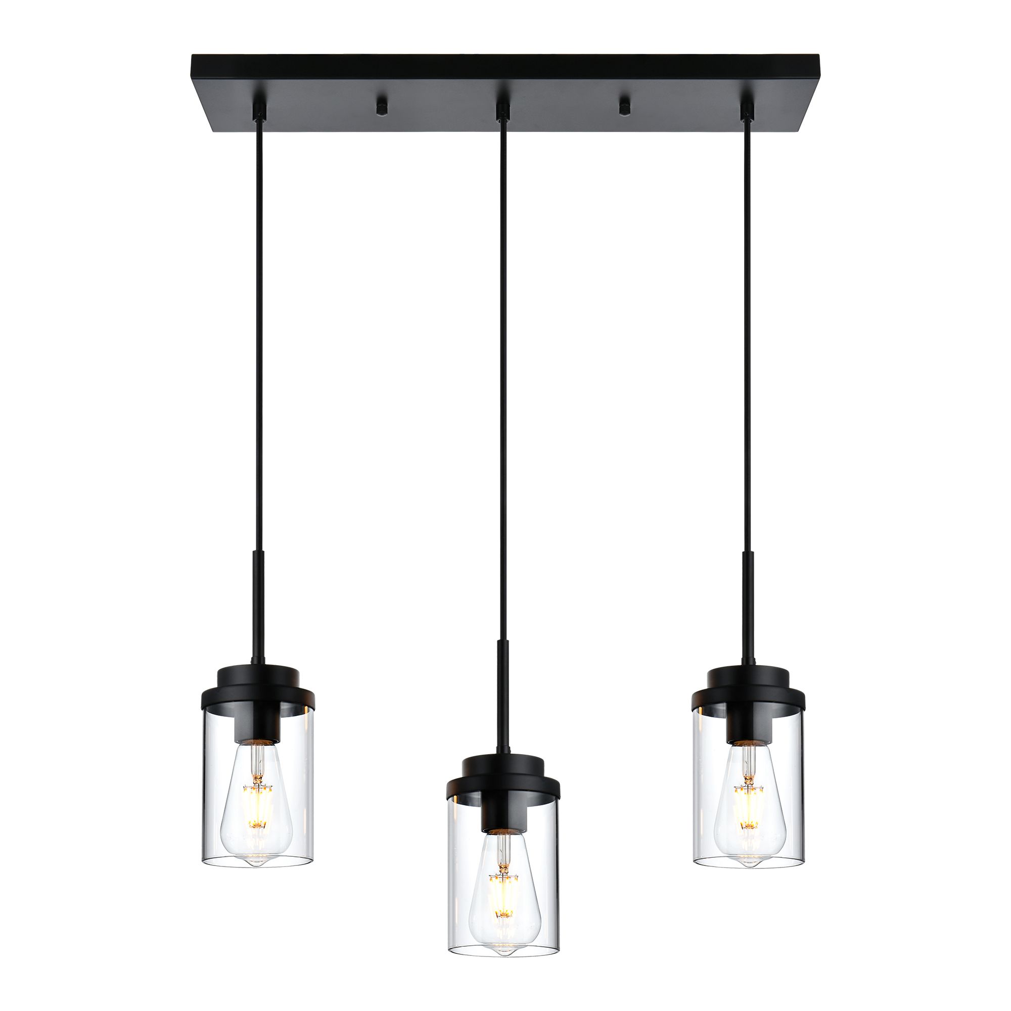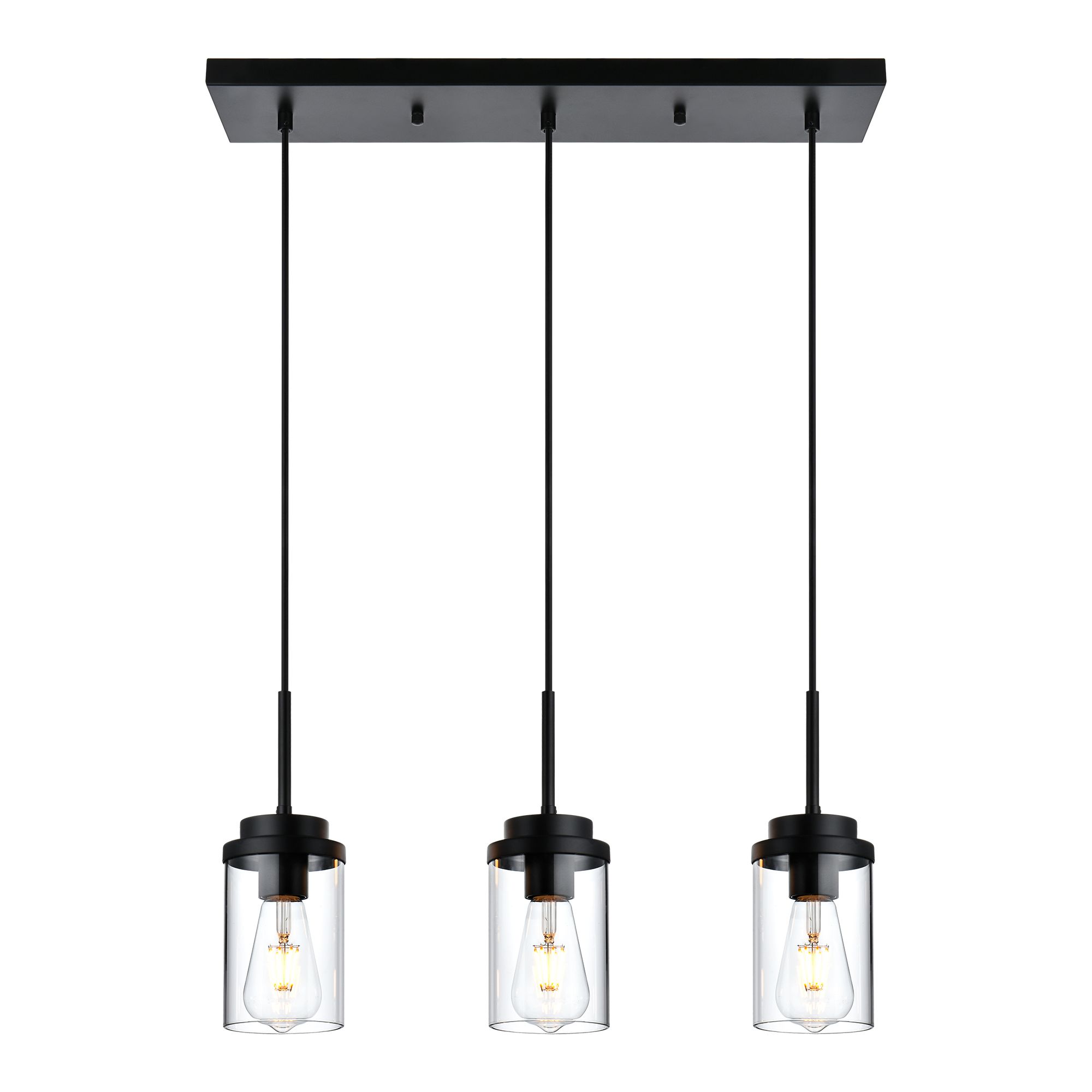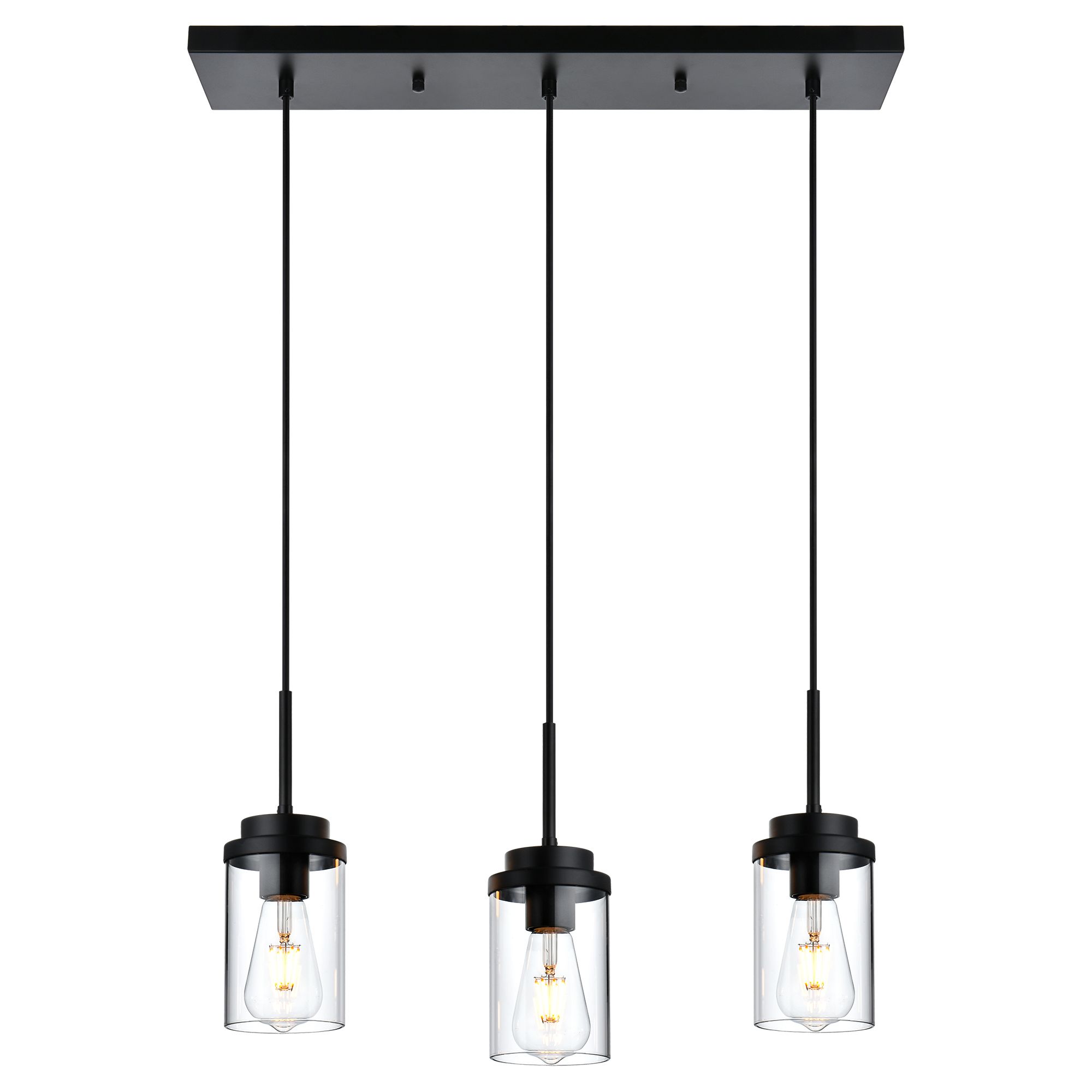 Streamlined matte black/ brushed nickel metal rectangular plate and dropping wires construction accented by 3 cylinder glass shades. Simple linear island pendant lighting eliminate traditional design concepts, add classy and unique beauty to any interior.