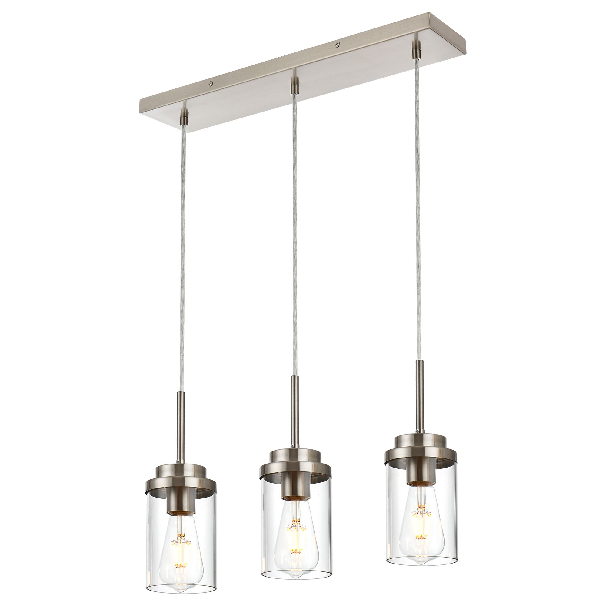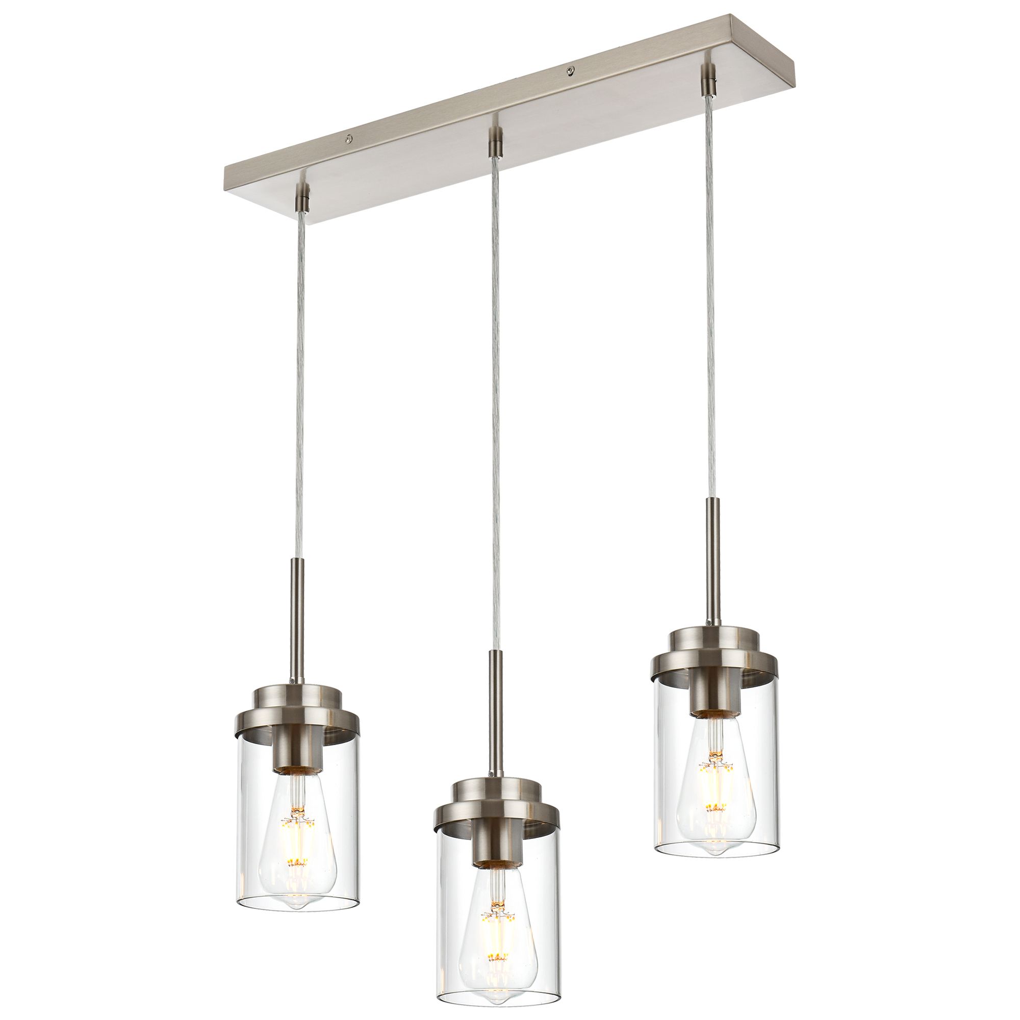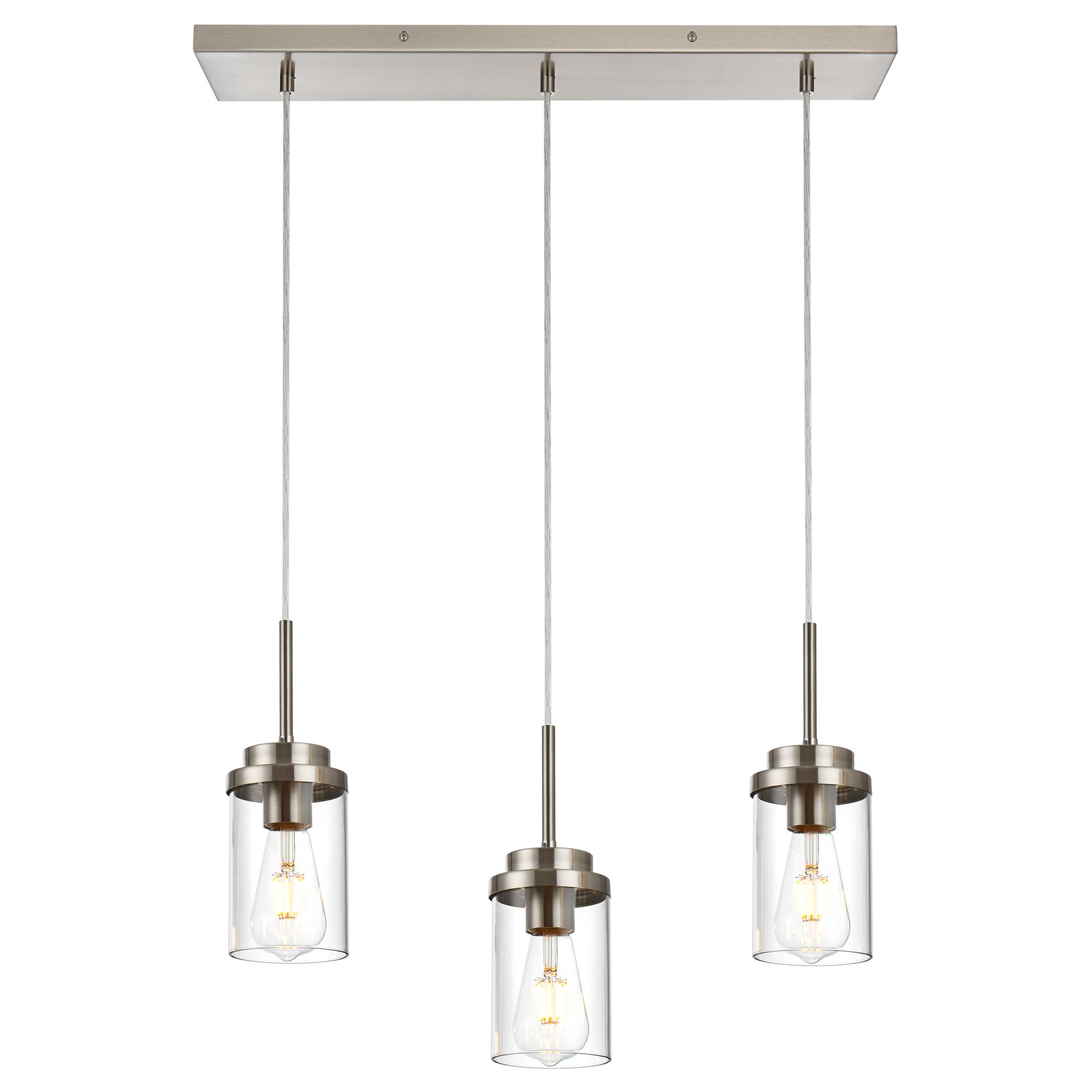 Streamlined matte black/ brushed nickel metal rectangular plate and dropping wires construction accented by 3 cylinder glass shades. Simple linear island pendant lighting eliminate traditional design concepts, add classy and unique beauty to any interior.