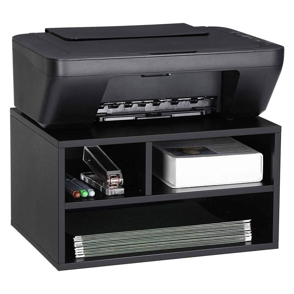 A printer that leaves no place for other office supplies? Lift the printer with this Modern Sturdy Black Metal Office Printer Stand with 2-Shelves and keep your office supplies in order. You'll wonder: Oh, is my desk bigger? Sometimes, simplicity can win the heart. Even with a simple design, this steel printer stand is robust and stable; its top surface can hold up to 110 lb, and its middle shelf can hold up to 33 lb. 3 open compartments with different sizes accommodate A4, A5, and legal size papers and a stapler; or, you can use it as a simple rack for books, calendar, or potted plants. Do you worry about complicated assembly? No problem. With a simple design, numbered parts, and illustrated instructions, you’ll assemble this printer stand with ease. A small helper can keep your office tidy, like this printer stand; together with papers, it’ll witness the moments you progress and accompany your every workday in the future.