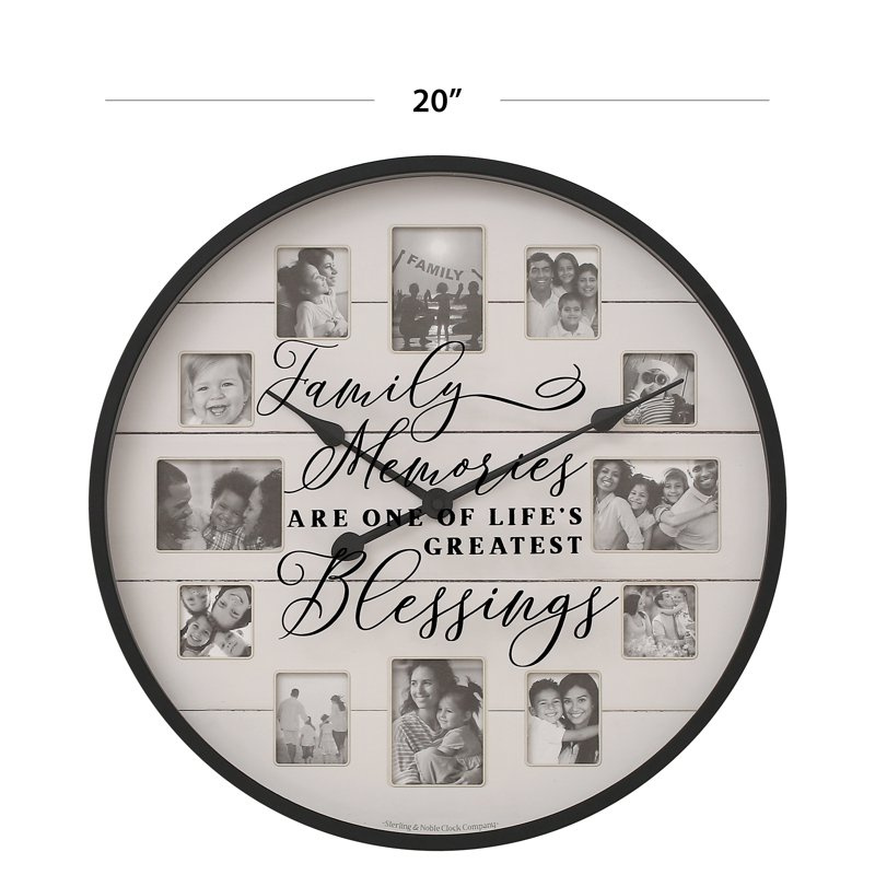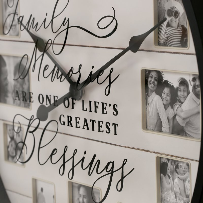 Make a bold and customizable design statement that truly reflects your style with the 20" Sentiments Photo Frame Wall Clock! This clock is not your average timepiece; it's an elevated design statement that adds sentimental warmth to any room in your home. With its charming farmhouse-inspired dial, modern black frame, and family-inspired sentiment message silkscreened on the glass, this clock is like wearing your heart on your sleeve. Each hour is marked by a unique space to display a cherished photo, making this clock a trove of beautiful family memories. The sentiment "Family memories are one of life's greatest blessings" is beautifully written on the glass, serving as a constant reminder of the love that fills your home. This unique blend of design and function is the perfect decorative statement for your home's walls, whether it be displayed in a living room, dining room, bedroom, or home office! Honor your commitment to family and love by displaying your precious moments with those you cherish the most. It's not just a clock, it's a testament to the gift of time and memories shared between mothers and fathers, grandparents, and children. This is the perfect piece to add to your home or to gift to a loved one, a unique timepiece where design meets function at its most heartfelt level.Sentiment Photo Frame Wall Clock, Farmhouse-Inspired* Photo Frame Analog Wall Clock* Clock Size: 20" x 1.85"* Displays 12 Photos* Silkscreened heartfelt sentiment on the glass lens* Farmhouse-inspired dial designinfo:We aim to show you accurate product information.